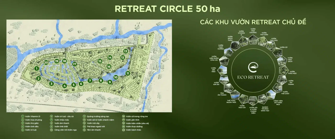 Trên diện tích 50 ha của Retreat Circle, cư dân được đắm mình trong không gian của 20 khu vườn chủ đề độc đáo – từ vườn Vitamin D nơi tận hưởng ánh nắng tự nhiên, đến vườn hoa chuông lãng mạn, vườn thư giãn yên tĩnh hay vườn tinh dầu thơm ngát. Mỗi bước chân đều là một trải nghiệm đánh thức mọi giác quan.