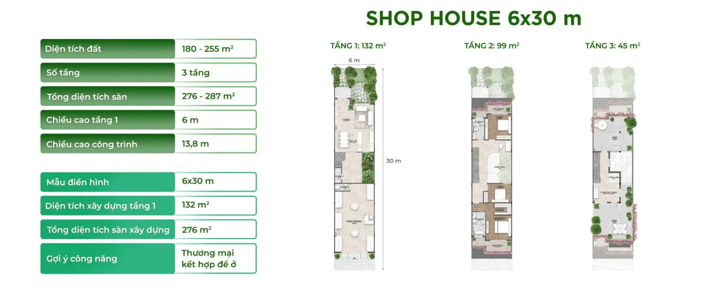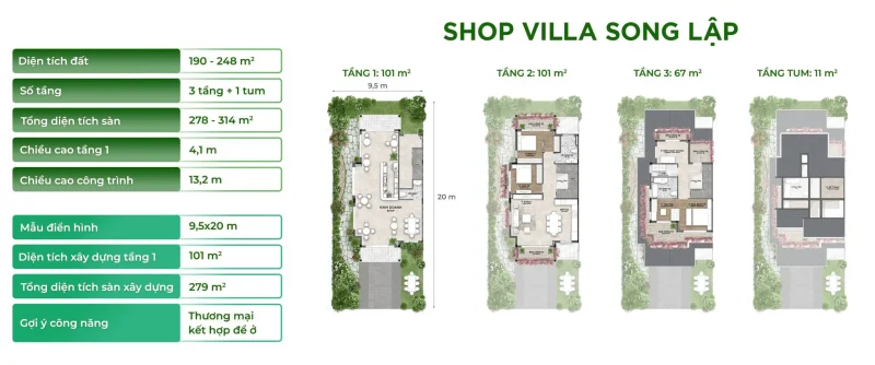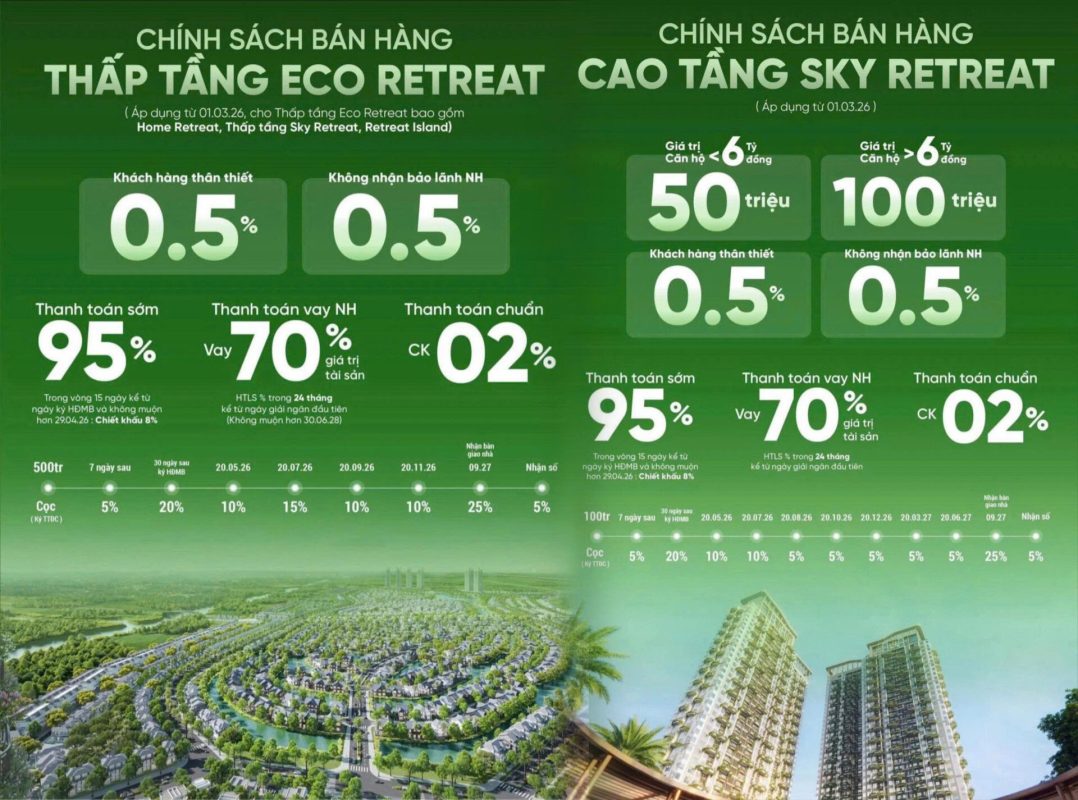 Eco Retreat mang đến 5 dòng sản phẩm đa dạng bao gồm Town House, Town Villa, Villa (Song lập và Đơn lập), Shop House và Shop Villa – tất cả đều được thiết kế bởi các đơn vị hàng đầu thế giới như Humphreys & Partners, Alpes Green Design, cùng cảnh quan độc đáo từ PLA Studio. Mỗi công trình đều là tác phẩm kiến trúc tôn vinh giá trị của không gian xanh và ánh sáng tự nhiên.